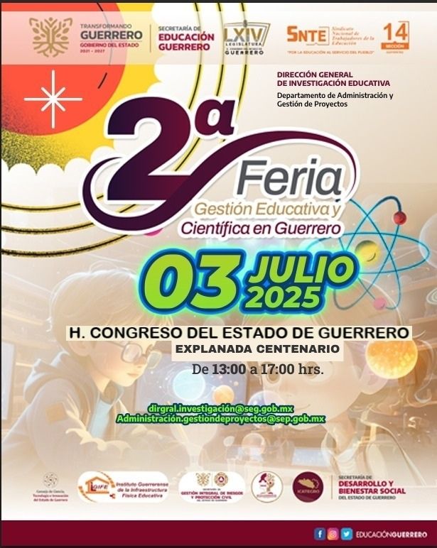Chilpancingo, Gro., 02 de Julio de 2025.- Convencidos de que la educación debe seguir siendo un tema prioritario de análisis, reflexión y acción, diputadas y diputados del Congreso del Estado de Guerrero, a través de la Comisión de Educación, Ciencia y Tecnología, invitan a participar en la 2ª Feria de la Gestión Educativa y Científica en Guerrero.
