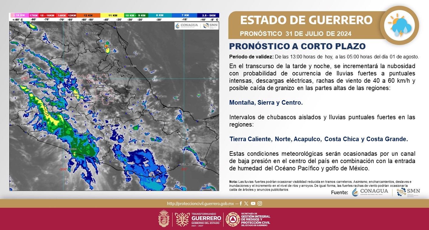 Además, con probabilidad de ocurrencia de fuertes lluvias a puntuales intensas, rachas de viento de 40 a 60 km/h, descargas eléctricas y caída posible de granizo, en las altas partes de las regiones Costa Grande. Acapulco, Costa Chica, Norte y Tierra Caliente.
