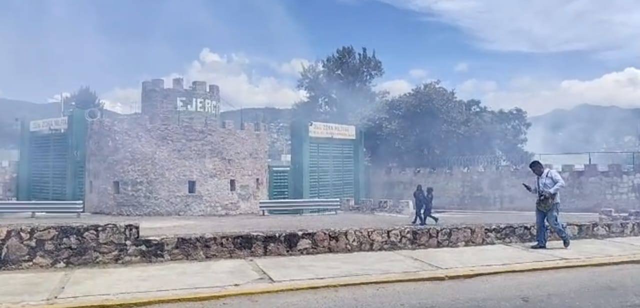 Al arribar al cuartel, los jóvenes realizaron pintas con consignas en los muros de acceso. Posteriormente, lanzaron petardos hacia el interior de las instalaciones militares, lo que provocó una respuesta inmediata de los elementos de la Secretaría de la Defensa Militar.