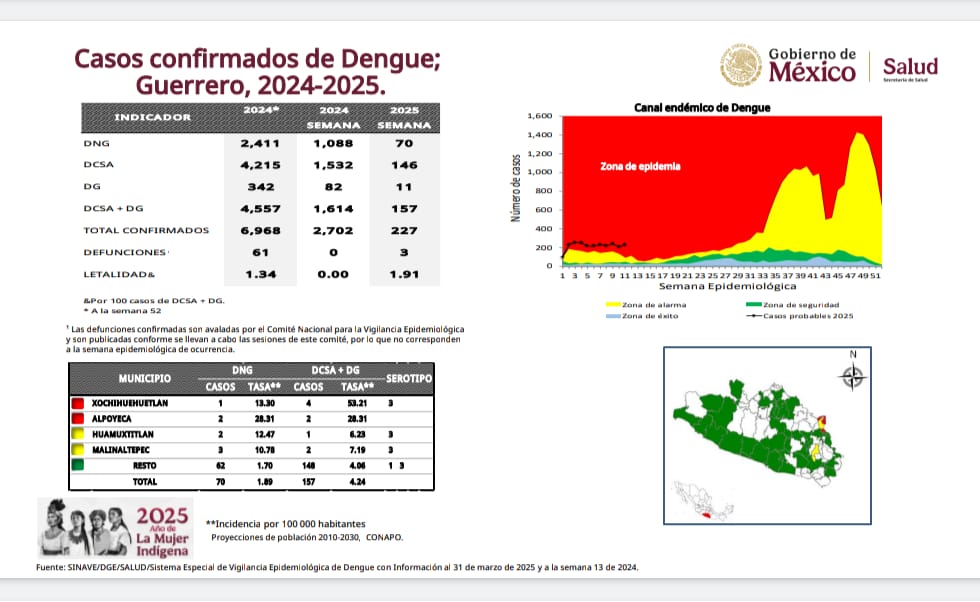 El estado de Guerrero enfrenta un incremento en los casos de dengue en 2025, con 227 contagios confirmados y 3 fallecimientos en lo que va del año, que lo ubican en tercer lugar nacional por debajo de Veracruz y Jalisco. Lo más alarmante es el aumento en la letalidad de la enfermedad, que pasó del 1.34 por ciento en 2024 a 1.91 por ciento en 2025.