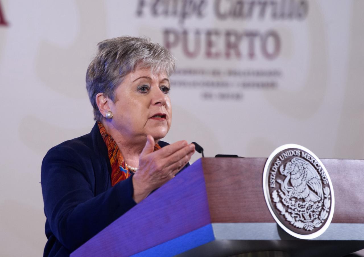 La secretaría de Relaciones Exteriores del gobierno de México, Alicia Bárcena Ibarra, durante la conferencia de prensa del 26 de febrero del 2024. Foto: Presidencia de la República.