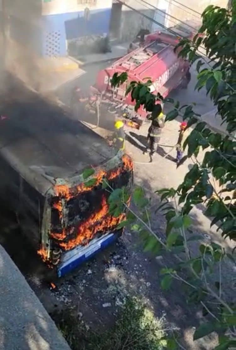 Acapulco, Gro., a 26 de enero de 2023.- Un camión urbano de color azul con blanco, que circulaba sobre una lateral de la avenida Cuauhtémoc, a la altura de la Garita, fue preso de las llamas de fuego.