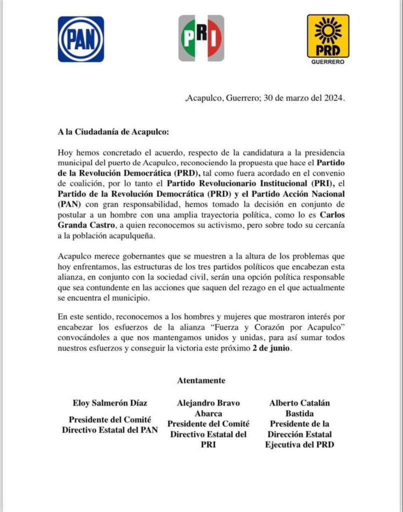 La alianza “Fuerza y Corazón por Acapulco”, conformada por los partidos Revolucionario Institucional (PRI); de la Revolución Democrática (PRD); y Acción Nacional (PAN), dio a conocer que el empresario Carlos Granda Castro será su candidato a la presidencia municipal de Acapulco.