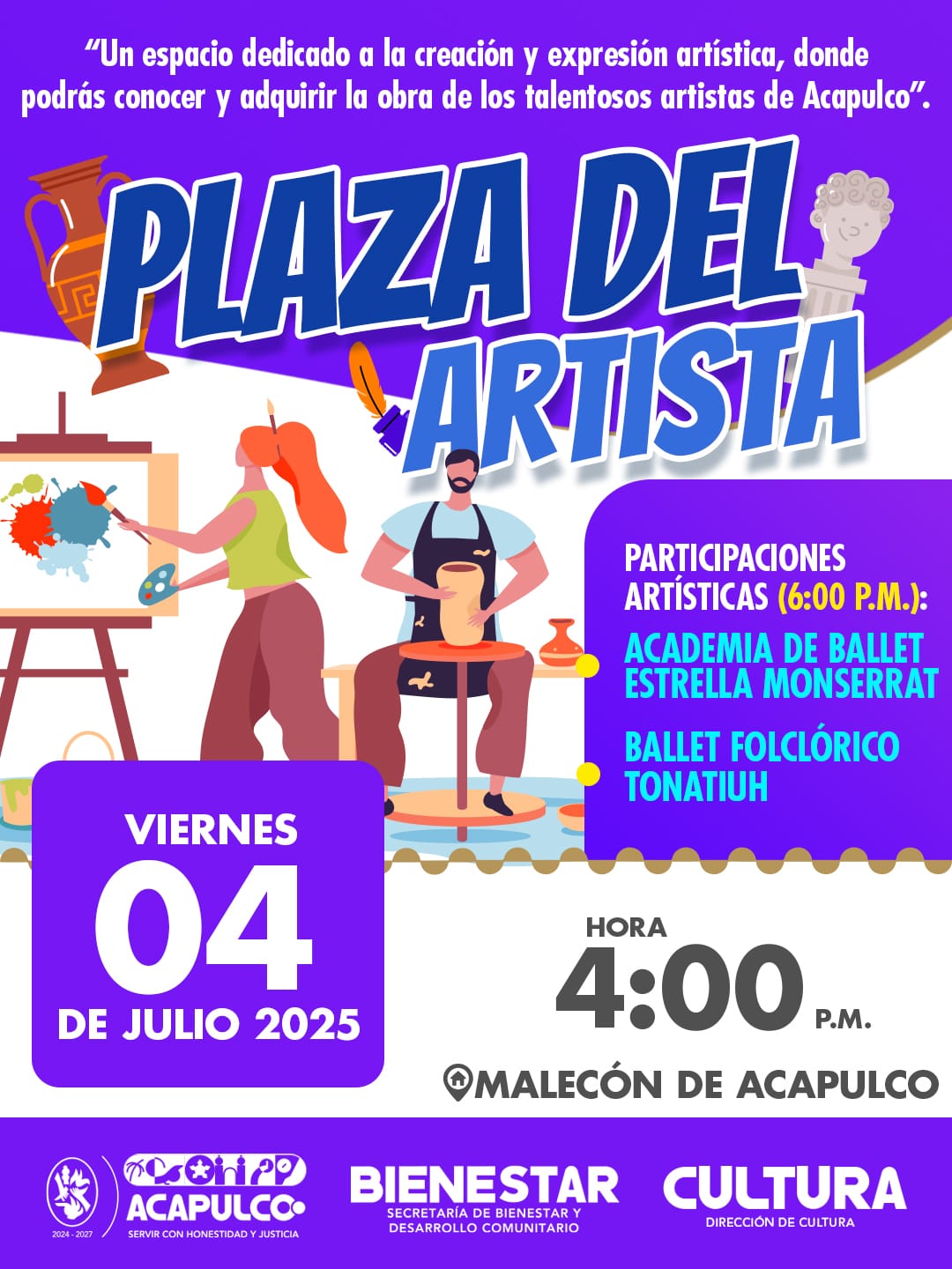 Acapulco, Gro., 03 de julio de 2025.- A fin de promover la cultura y al mismo tiempo impulsar la economía de las familias acapulqueñas, el Gobierno Municipal que preside Abelina López Rodríguez a través de la Secretaría de Bienestar y Desarrollo Comunitario, convoca a la población a la Plaza del Artista.