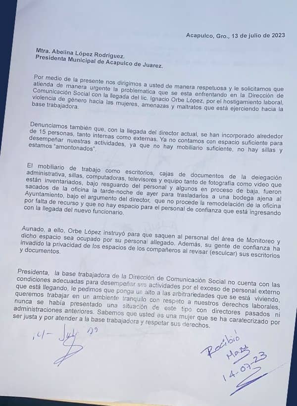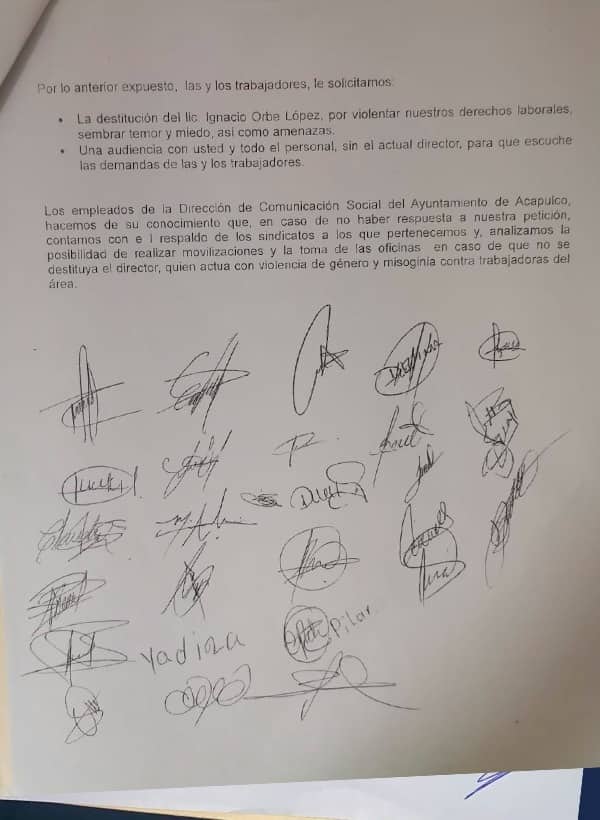 Trabajadores de la Dirección de Comunicación Social del gobierno de Acapulco pidieron a la alcaldesa, Abelina López Rodríguez, la destitución del recién designado director de esa dependencia, Ignacio Orbe López, «por violentar nuestros derechos laborales, sembrar temor y miedo, así como amenazas».