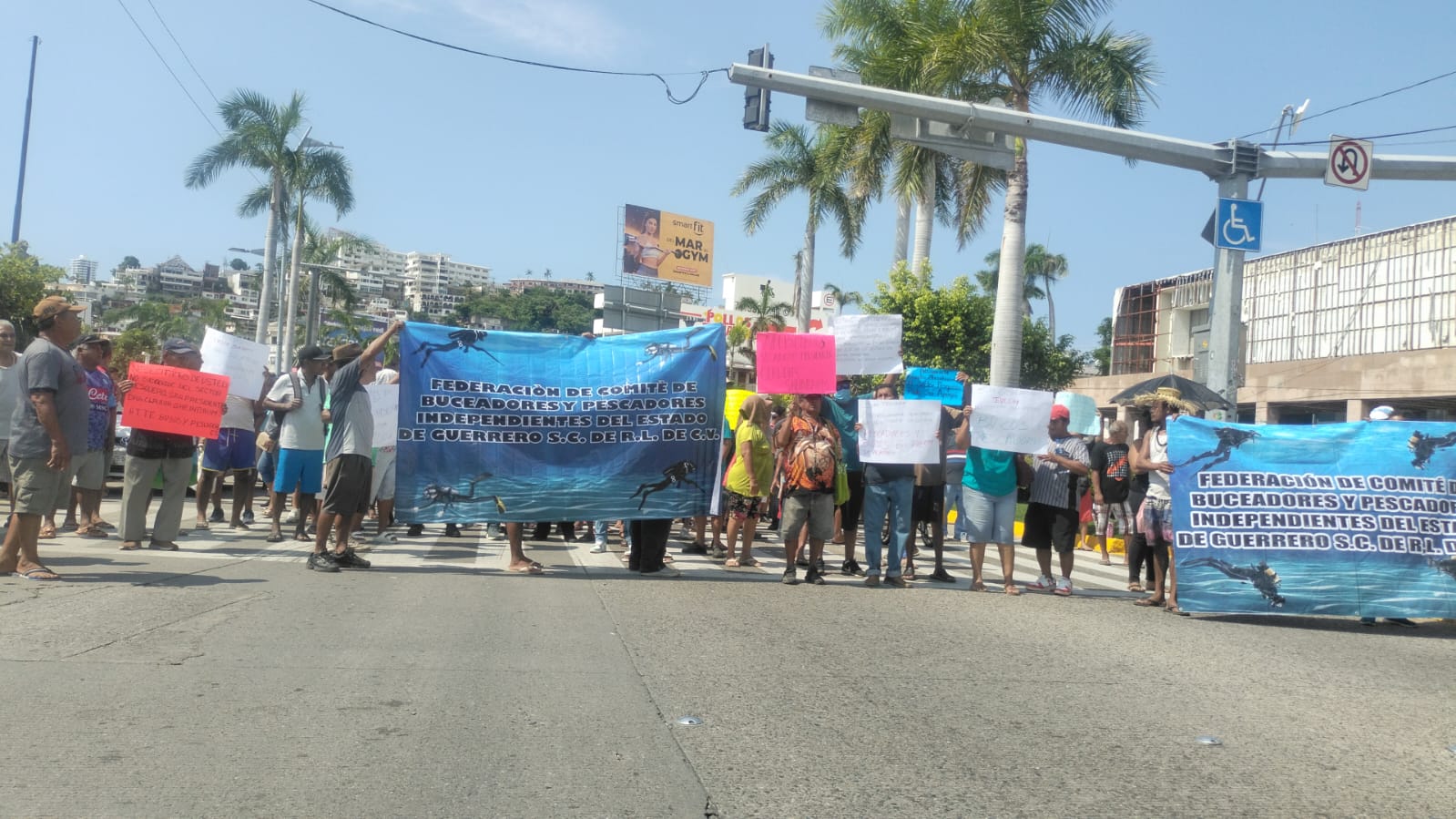 Acapulco, Gro., a 10 de octubre de 2024.- Integrantes de la Asociación de Buzos y Pescadores Independientes del estado de Guerrero, marcharon por la Costera Miguel Alemán, del Zócalo a la playa las Hamacas en Acapulco, son 700 alrededor de familias que exigen al gobierno federal, ser censados para recibir apoyos, porque aparte de ser damnificados por el huracán Otis y John no han podido salir a pescar.