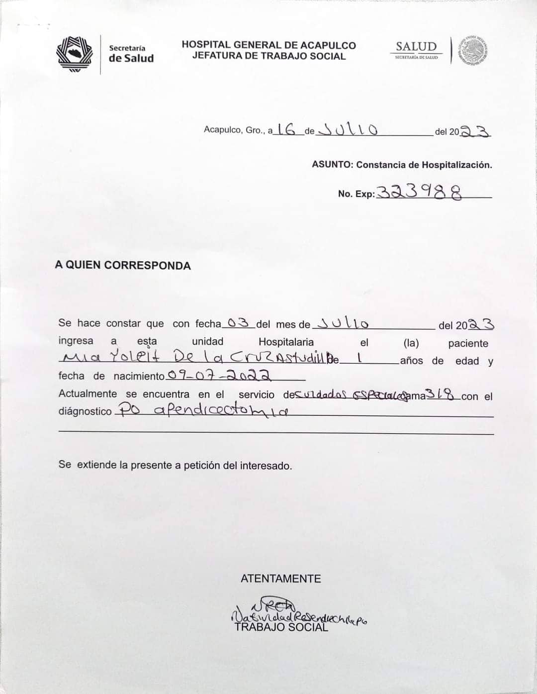 Atoyac de Álvarez, Gro., a 22 de julio de 2023.- La madre de una menor que lucha  por su vida en un hospital del puerto de Acapulco, solicitó del apoyo de la ciudadanía en general, tanto de este municipio de la Costa Grande, como de otras latitudes del estado.