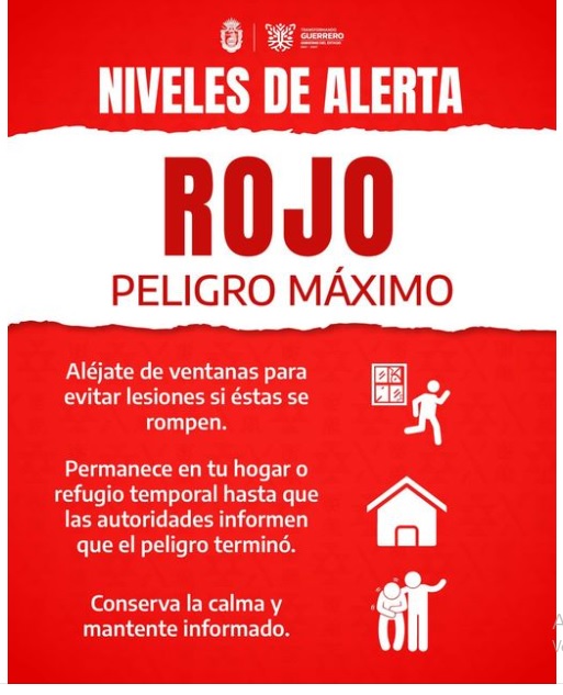 Ante esta situación anuncia que se ha declarado ALERTA ROJA durante las siguientes horas, “por lo que es fundamental intensificar las medidas de prevención, especialmente en la zona de riesgo de nuestras costas, que abarca desde San Marcos, en la Costa Chica, Acapulco y Zihuatanejo en la Costa Grande, donde se espera que este fenómeno impacte con mayor fuerza en las próximas horas”.
