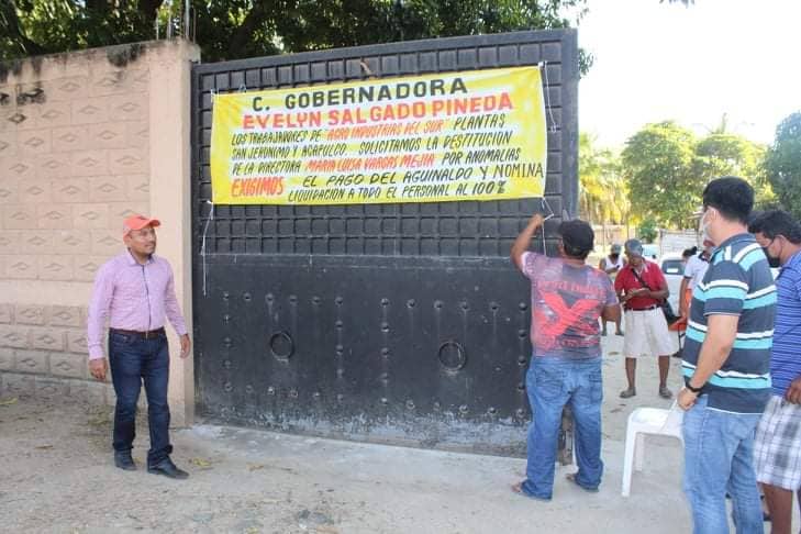 Mediante una manta que colocaron en el portón principal, los trabajadores solicitaron a la gobernadora Evelyn Salgado Pineda, «la destitución de la directora María Luisa Vargas Mejía por anomalías».