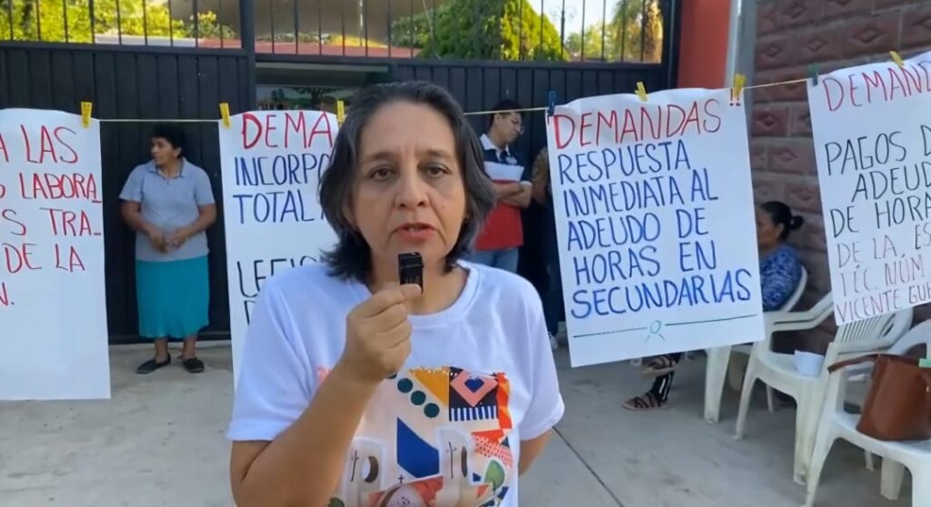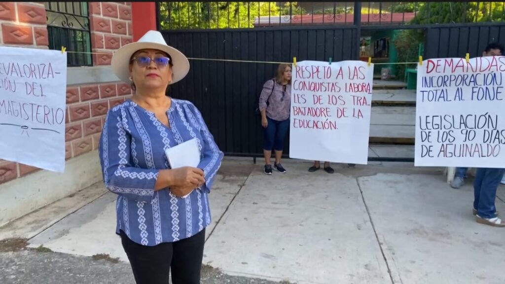 Colocaron pancartas frente a la escuela secundaria, en las que escribieron algunas de las siguientes demandas: Respuesta inmediata al adeudo de horas en secundarias, regularización de claves directivas y de docentes, entre otros reclamos al secretario de Educación en la entidad, Marcial Rodríguez Saldaña.