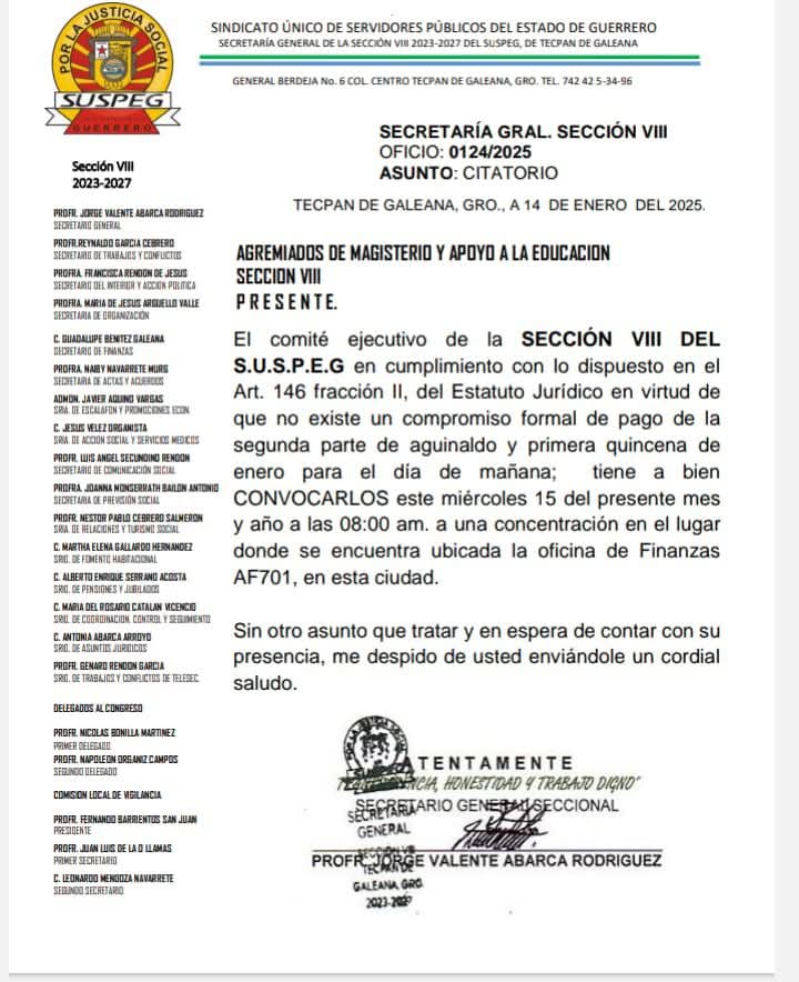 Anuncian dirigentes de la sección VIII del Sindicato Único de Servidores Públicos del Estado de Guerrero (SUSPEG), la toma y cierre de la Agencia Recaudadora Fiscal, para este miércoles 15 de enero del 2025, en Tecpan de Galeana, Guerrero, a partir de las 8:00 horas de la mañana.