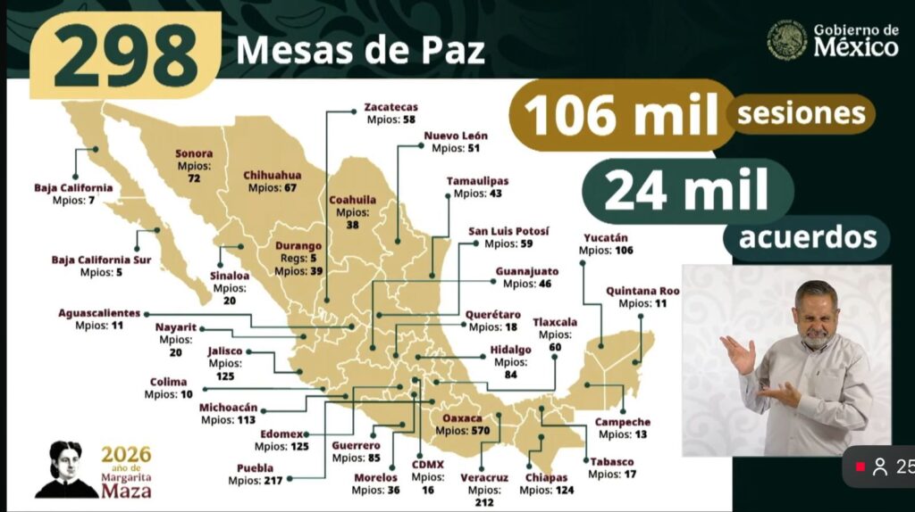 Asimismo, señaló que a nivel nacional operan 298 Mesas de Paz, de las cuales en Guerrero participan 85 municipios, fortaleciendo la coordinación interinstitucional para la prevención de la violencia y la reconstrucción del tejido social.