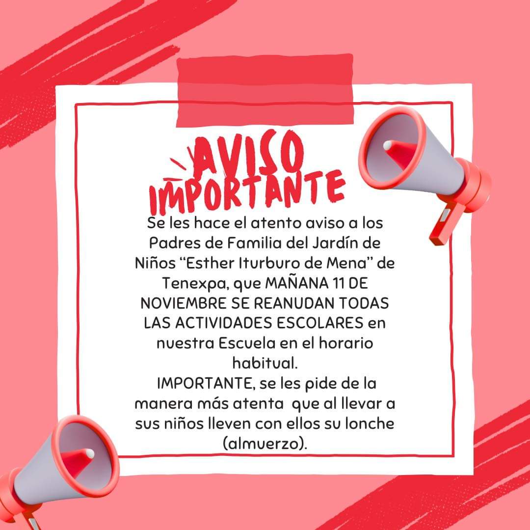 Hoy lunes 11 de noviembre del 2020, reanudarían clases algunos centros educativos, en el municipio de Tecpan de Galeana, Guerrero, como en el jardín de niños Esther Iturburú de Mena, en la población de Tenexpa, en donde también se registró el hallazgo de varios cuerpos sin vida, tras los hechos de violencia que comenzaron el 25 de septiembre último, luego de la irrupción de un grupo armado autodenominado GNG.